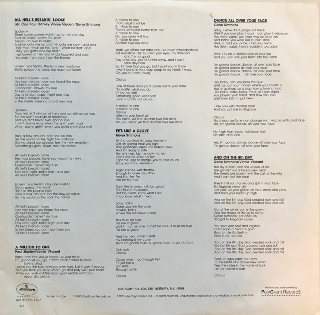 1. I think ‘Creatures of the Night’ is a way better album, but there are some great tunes on ‘Lick It Up.” I agree with you about deleting “Dance All Over Your Face” and “On the 8th Day,” especially the latter. The message with that one was weird and cheesy to me. Unpopular opinion, ‘Lick It Up’ wouldn’t have been a success if the band hadn’t taken off their makeup!