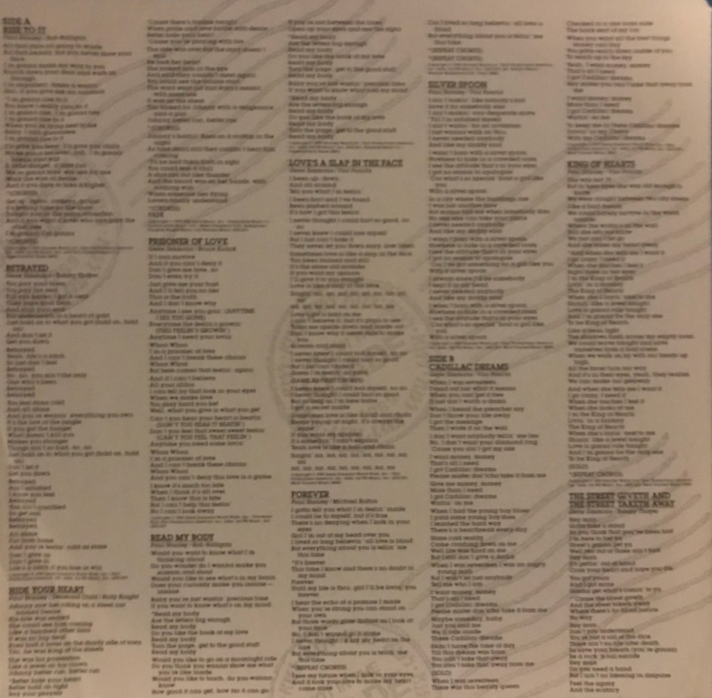 The first side finally ends with “Silver Spoon” which is another Paul song and written by him and Vini. It was Paul trying to not to write a sex song…good luck with that. I will admit that song is catchy as hell and has some nice playing on it. It even has a few women on backing vocals by the names of Charlotte Crossley, Valerie Pinkston and Kim Edwards-Brown. Compared to a lot of the songs on the album, this one scores on the plus side as overall it is memorable enough that I catch myself singing it when I’m not listening to the album. Points for that.