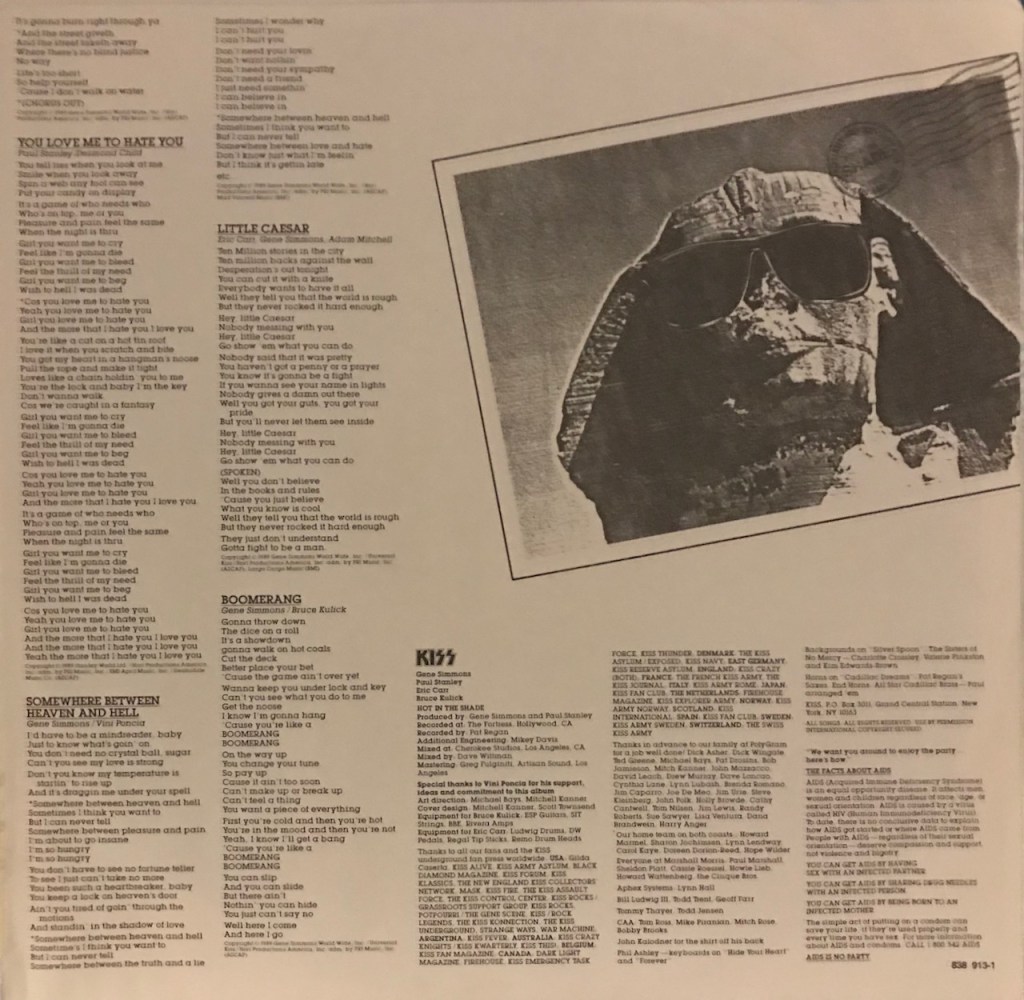 Then we get the first single off the album and one of the very few Kiss song I truly despise and that is “Hide Your Heart” written by Paul, Desmond Child and Holly Knight. After the success Desmond Child had with “Livin’ On a Prayer’ with Bon Jovi, Paul Stanley wanted to write a song in that same vein. Instead of Tommy and Gina, we get a cheap knock-off version of Johnny and Rosa. The problem with their relationship wasn’t the hardships of life, but that Rosa had a boyfriend named Tito who sounds like a gang leader in the shady part of town. Already, we know Rosa has bad taste in men. The story doesn’t end well like Tommy and Gina did. Basically this was a poor man’s version of “Livin’ on a Prayer” and the storyline sucked and was a total rip-off. It was too formulaic and Kiss too busy trying to chase trends at the time instead of being a leader and this was a perfect example of the trash that came out as a result.