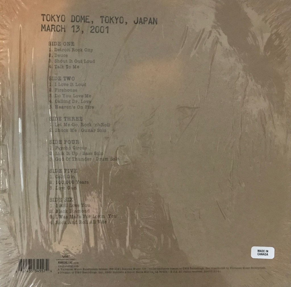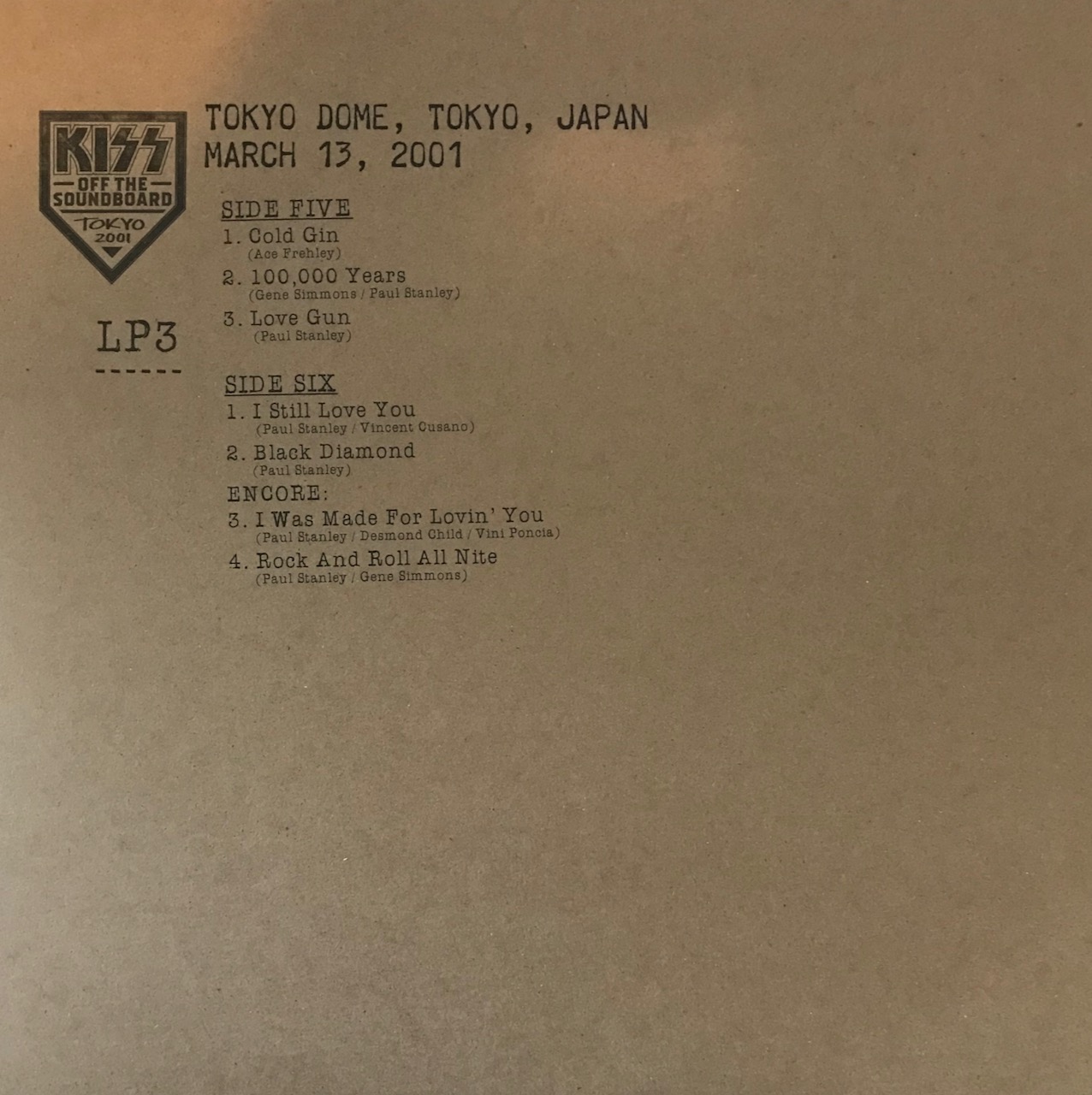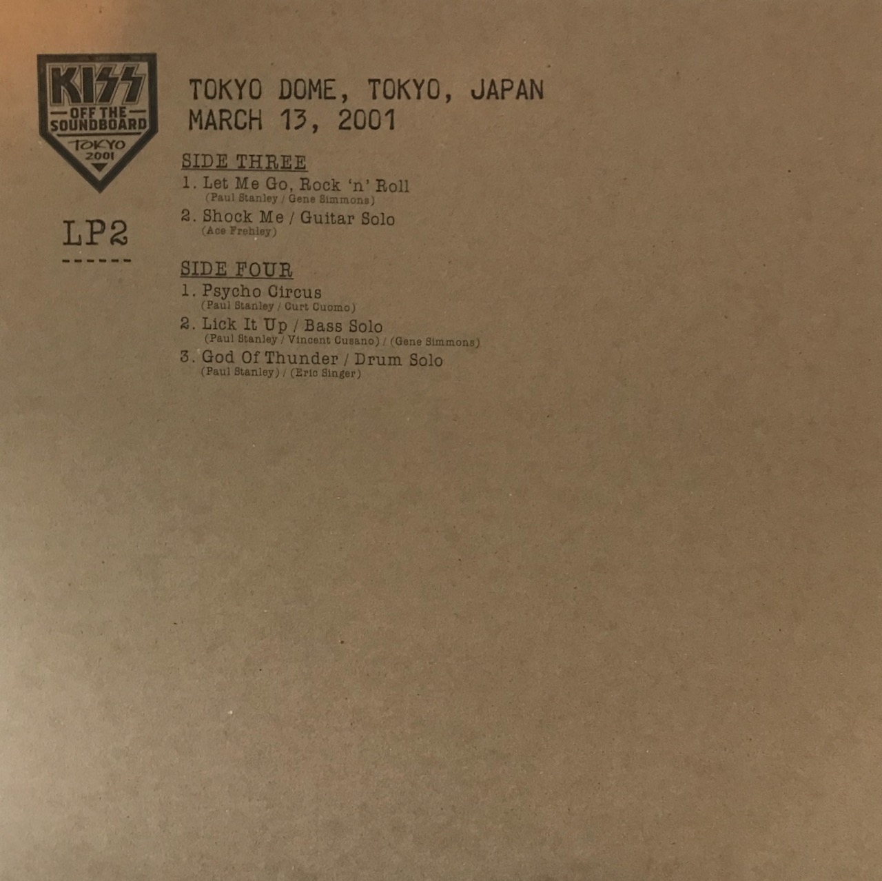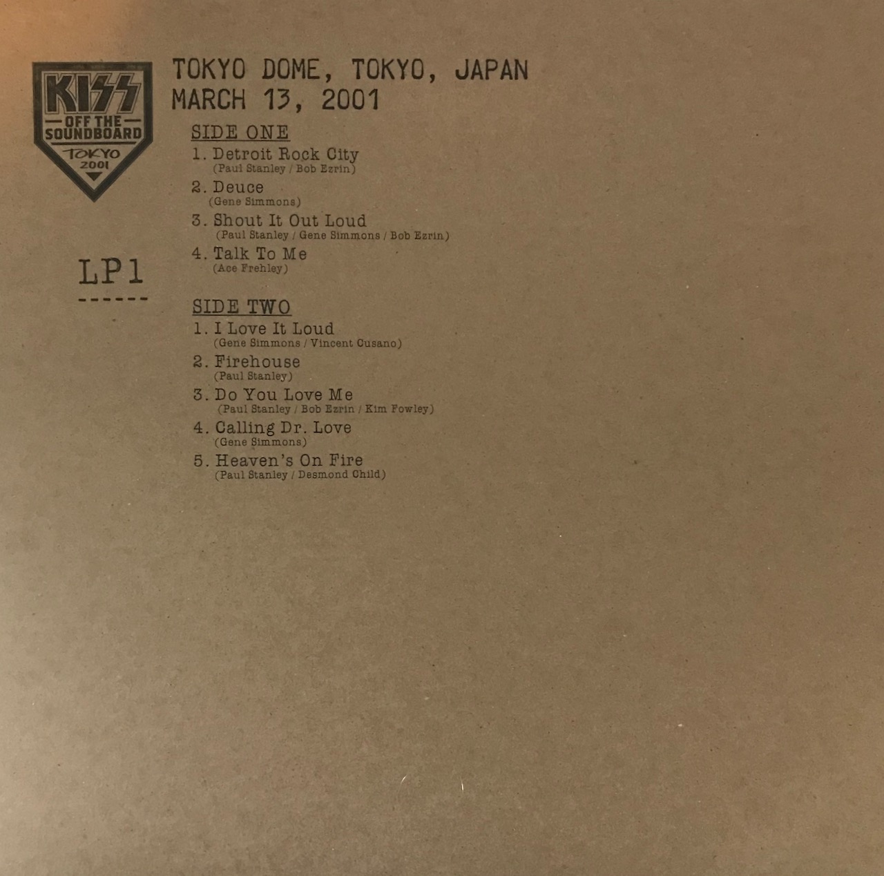 The show for this release was on March 13, 2001 at the Tokyo Dome in Tokyo, Japan. This was actually part of the Farewell Tour and really close to the end. As I mentioned earlier, by the time this show was done, Peter was gone and Eric Singer was brought in. This set list is impressive. It contains 21 songs and includes all the solos, the great Paul Stanley banter and all mistakes which is exactly what you want from a bootleg. The show is over 2 hours long and does cover 3 LPs. Kiss didn’t skimp on this release in the least.