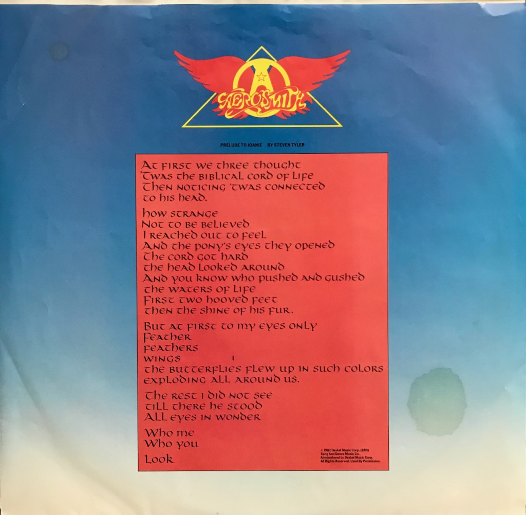 Side 2 opens with the incredible strange “Prelude to Joanie”. It has some synthesizer sounding, robot vocals and atmospheric tone. It might be the most bizarre thing they have ever done, but it really isn’t a song as much as a long introduction to the song “Joanie’s Butterly” which starts off as an acoustic number with John Lievano on guitar. There are some Mid-Eastern sonics to it which make for an interesting listen. The song then stops and becomes a rocker. There are some great percussive moments in the song as well. Towards the end we even get some violins. This might the most experimental I believe Aerosmith has ever gotten. Does it work? I’m can’t say for sure, but it certainly is interesting.