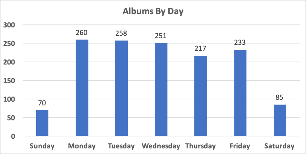 With all that data, I am able to give you lots of useless information that I thought would be fun. So let’s get started. How many albums did 2 Loud 2 Old Listen to in 2021? Easy…1,374!! If I was working in the office, the number probably would’ve been no where even close to that number. Now let’s get in to the juicy details. Out of the 1,374 albums, there were 609 unique albums I heard during the year.