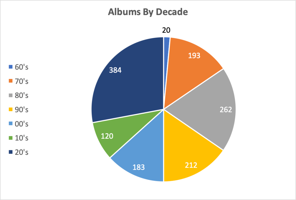 No surprise with all my new release listens, 2020 is the winning decade with 384. The next closest is probably no surprise either with the 1980’s at 262 listens.