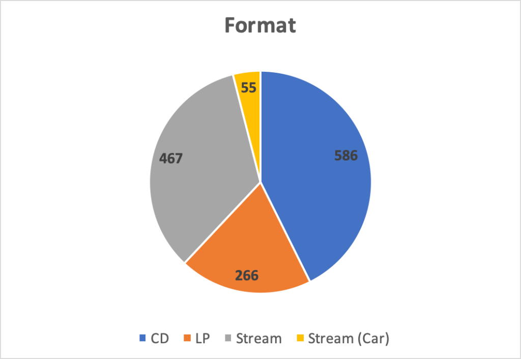 Was is Vinyl, CD, Streaming or Streaming in my Car? If this was a normal year where I was driving in to work everyday, I bet Streaming in my Car would be #1, however, this was not a normal year. So you probably thing Vinyl as I am amassing a large collection, but that is wrong as well. It was actually CDs and that is only because the Judas Priest and Queen Series was all CDs. Plus, all my Will Hoge and Jeff Scott Soto albums are in CD format as well. Here is a wonderful chart for you (this should make Geoff happy)…