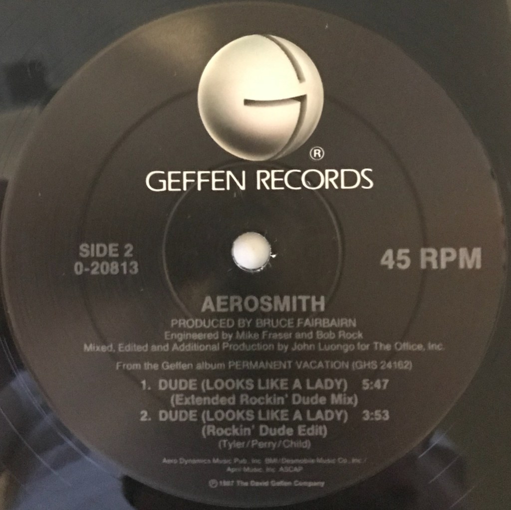 Side 2 only has two mixes on it. The first is the “Extended Rockin’ Dude Mix”. Extended of course means longer and it clocks in at 5:47. It has more real drums and guitars in it and the instrumental pieces are drawn out more. We get a lot of Steven singing “Dude (Looks Like a Lady)” before we actually get to the verses. For these types of singles, you have to really enjoy the significant changes to the song to make it worth you purchasing. I don’t mind them, but for me it is more about collecting and having the different versions that is about the quality of the mixes.