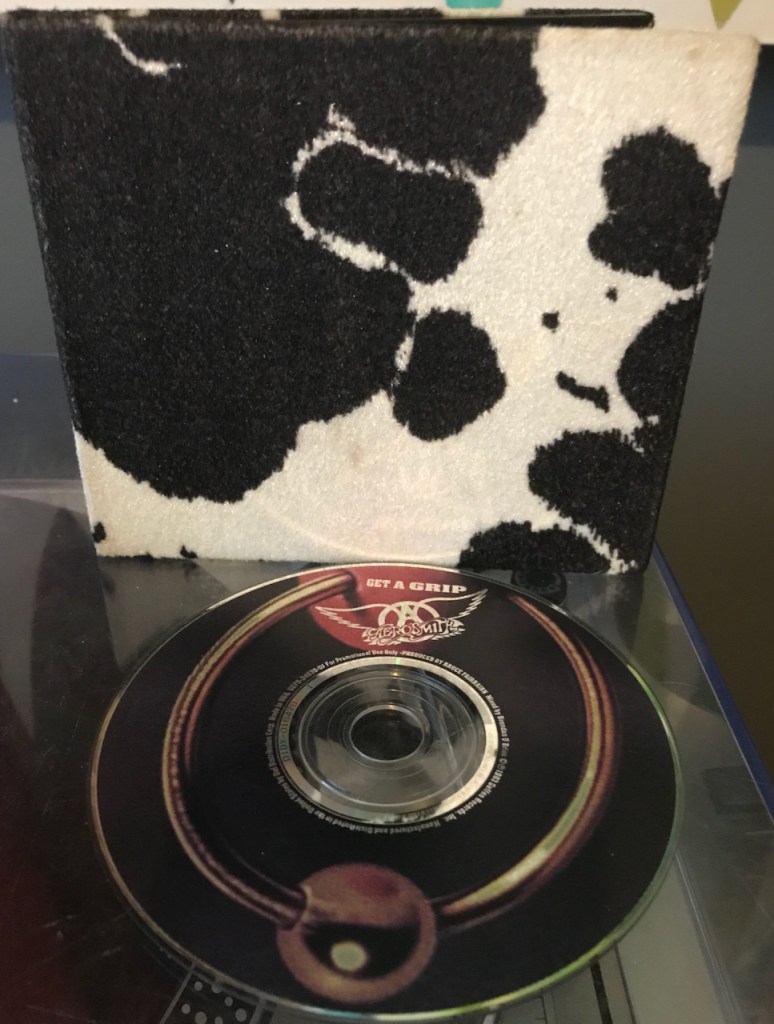 My copy of the album is a little strange. It is a CD, but it is the limited edition with the cowhide cover on the front and back. The only thing it is missing is the the Chic-fil-a logo and a sticker saying “Eat Mor Chikn”. The actual cover of the album as shown above was done by Hugh Syme who came up with the whole cow theme with the Aerosmith branding and the nipple piercing on the udder. Really not sure how it relates to the album, but I like it. One other thing about the album is that on June 27, 1994, the band released the digital only song “Head First” which is was only available to Compuserve customers. They probably spent hours waiting for that thing to download over dial-up. And then were probably pissed because eventually it was released physically as the B-Side to “Blind Man” off their ‘Big Ones’ greatest hits album a year later.