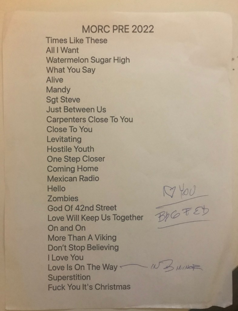 They didn’t play every song on the setlist as I think they used this same sheet from the night before in South Carolina as the “I Love You” on the paper was from Saigon Kick bass player Chris McLeron who was at that show. I know that because that is what Jeff told me. And another thing I noticed, the header says “MORC PRE 2022” which means this is also the set list from when they did the Pre-Show at the Monsters of Rock Cruise a few weeks earlier. Cool!