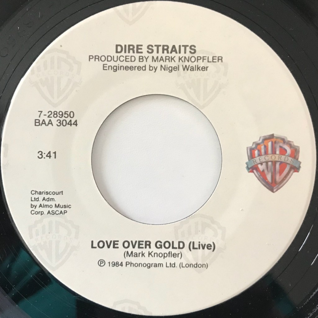The B-Side is the beautiful song “Love Over Gold” played live. The original song was off the 1982 album of the same name. I believe the live recording was from their album “Alchemy: Dire Straits Live”. Which was only available on the CD version and not the album. A great slowed down track and definitely more serious sounding then “Money For Nothing”. It has some great picking by Mr. Knopfler as well.