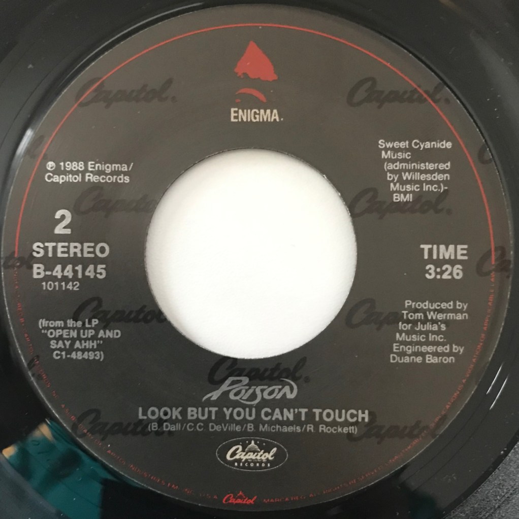 The B-Side is “Look But You Can’t Touch” and it is another solid rocker. It has another great CC riff, but this one is dirtier and a little nastier. The song is heavy and has a darker tone, but the lyrics are pure and utter trash. Hell, Poison wasn’t writing Shakespeare, heck they weren’t even writing Dr. Suess. The song is about trying to get a piece of ass but the woman is having none of it. Either commit to her or you ain’t getting any. Look but you can’t touch unless you are planning on buying with a wedding ring.