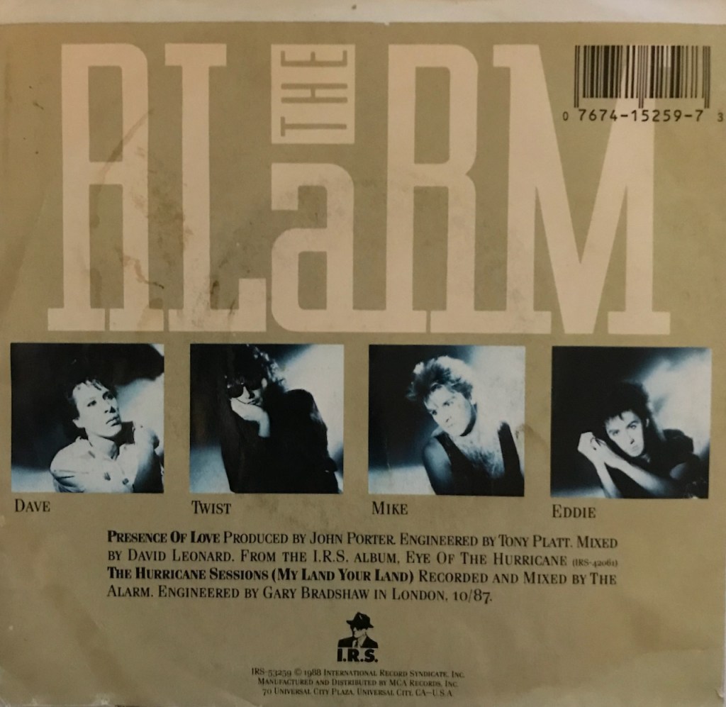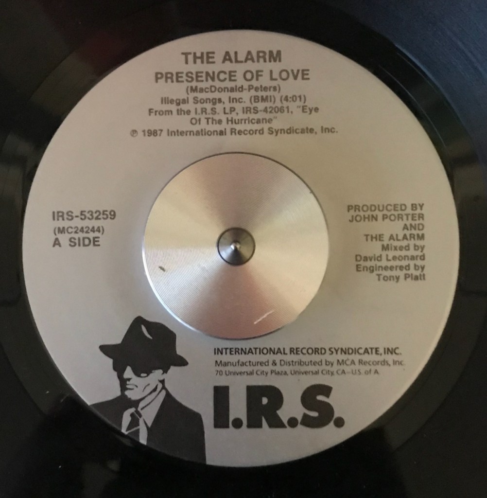 At the latest record show here in Charlotte, I found a handful of great 7″ Singles as there is always this one guy that has an amazing collection of them to sell. I always find a handful of pristine and cool ones to grab and this one is no different. This time I found one by a band I really enjoy called The Alarm. The song was “Presence of Love” off their 1987 album ‘Eye of the Hurricane’. It was the third and final single and just missed cracking the Top 40.