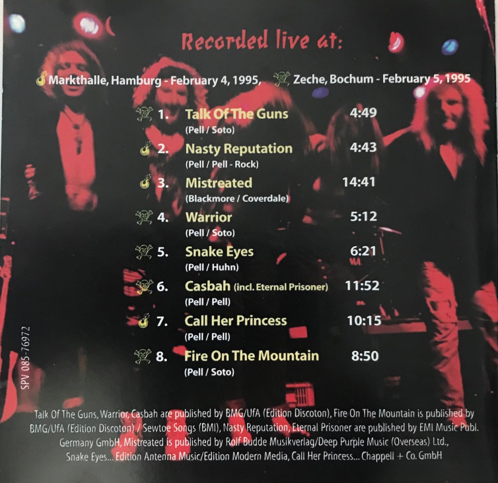 Axel Rudi Pell has had four solo albums so a live album was long over due. As a result, during two shows on February 4th & 5th of 1995, they were recorded so a live album could be released. They were recorded in Markthalle, Hamburg and Zeche, Bochum. There were three songs from the Markthalle show and five from Zeche. The band was of course Axel Rudi Pell on guitar, Jeff Scott Soto on vocals, Jorg Michael on drums, Volker Krawczak on bass and Julie Greaux on keyboards. It was the same band that recorded the previous album ‘Between the Walls’ for which they were now touring for that album, and it is a great, solid band.