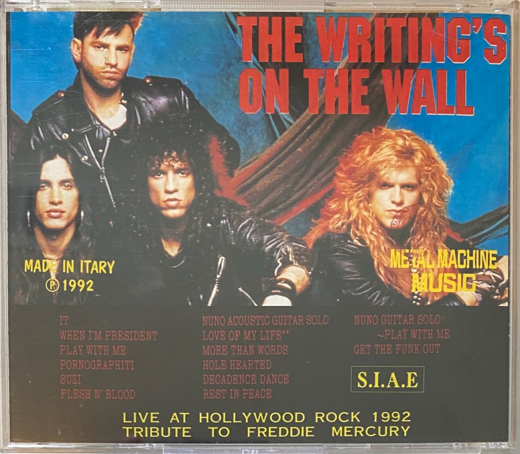 What I love about Bootlegs are the errors. Yes, they have errors. The reason why is the people that make bootlegs don’t give a crap about editing and making things perfect and accurate. They only care about getting out product. The first major error is where it was made. The album was made in Italy…however, the back cover says it was made in Itary. I have been looking at a globe for about 10 hours now and I can’t find Itary anywhere on it. Then it is the song titles…”Pornograffitti” is spelled as “Pornographiti” and what should be a Nuno acoustic guitar solo actually says that he sold his acoustic guitar.