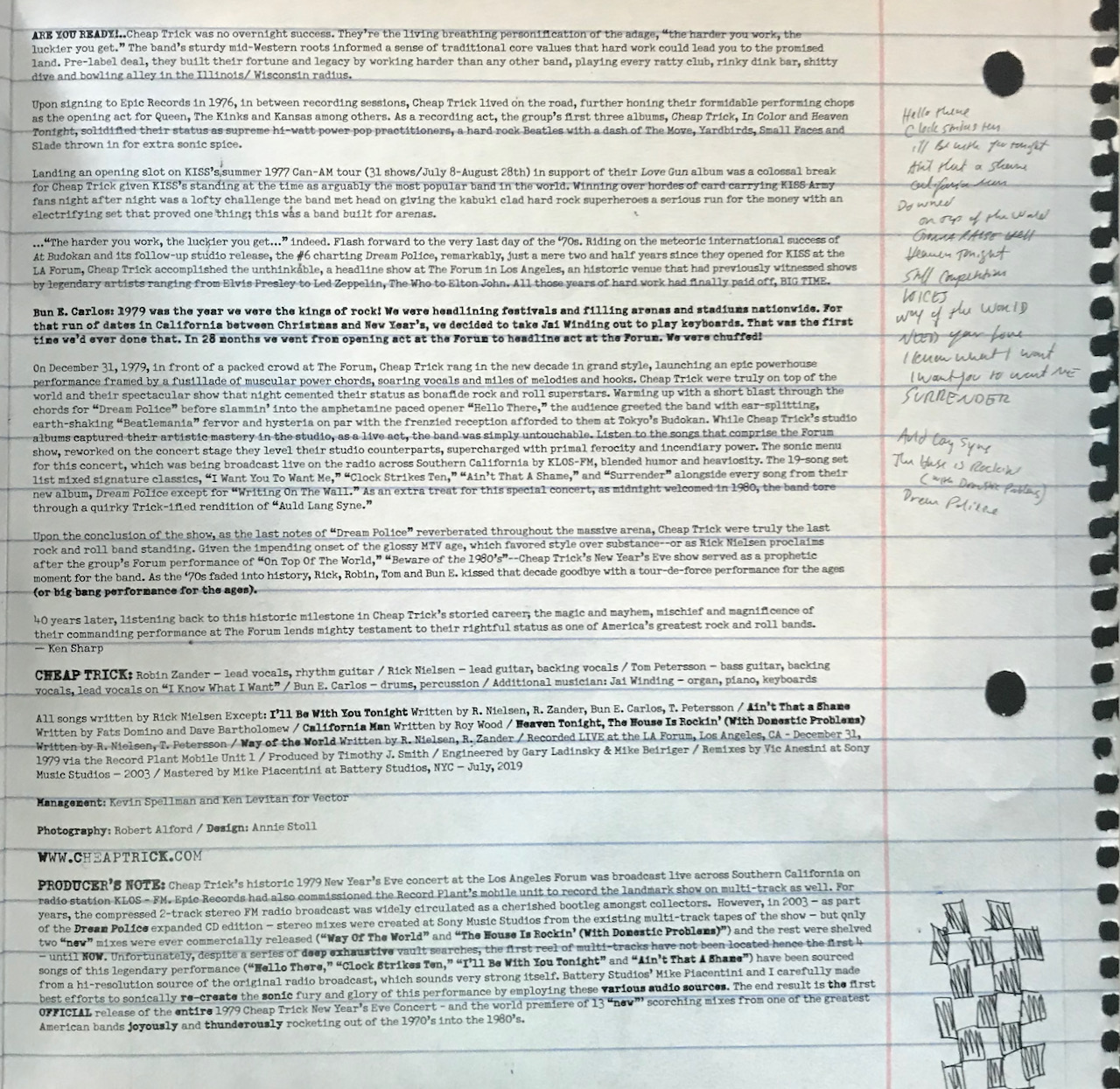 Cheap Trick has hopped on the Record Store Bandwagon with 3 previous releases for each Volume of The Epic Archives and now for the 2019 Record Store Day they dug in to the archives and are finally releasing their New Year’s Eve concert from the Fabulous Forum in Los Angeles from 1979 in full. Some songs were released on the Expanded Edition of the ‘Dream Police’ album, but never the full show. This is the first time it has been released on vinyl, the first time the full show has been released giving is new mixes from the original master tracks. The only issue is the first reel of the master tapes could not be found, so the first four songs aren’t as clean and crisp as the rest of the album. They had to source those songs from a high resolution tape of the official radio broadcast. You can tell the difference in the listen, but honestly, it has zero impact on the listening pleasure.