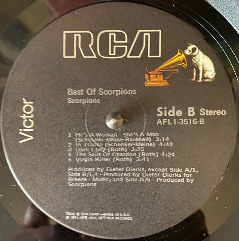 Side two sees the band go straight-up beast-like Metal with “He’s a Woman, She’s a Man” off of ‘Taken by Force’. A heavy riff which might the heaviest they’ve ever done or at least on this album. It is brutal. Herman really pounds away on the drums that makes the guitar riff seem even heavier and it is almost Thrash. A catchy chorus and more Klaus vocal dexterity with this broken English makes it all an utter blast. If your head ain’t banging on this one, you ain’t playing it loud enough!! This was also Herman Rarebell’s first writing credit and what an introduction to his talent.