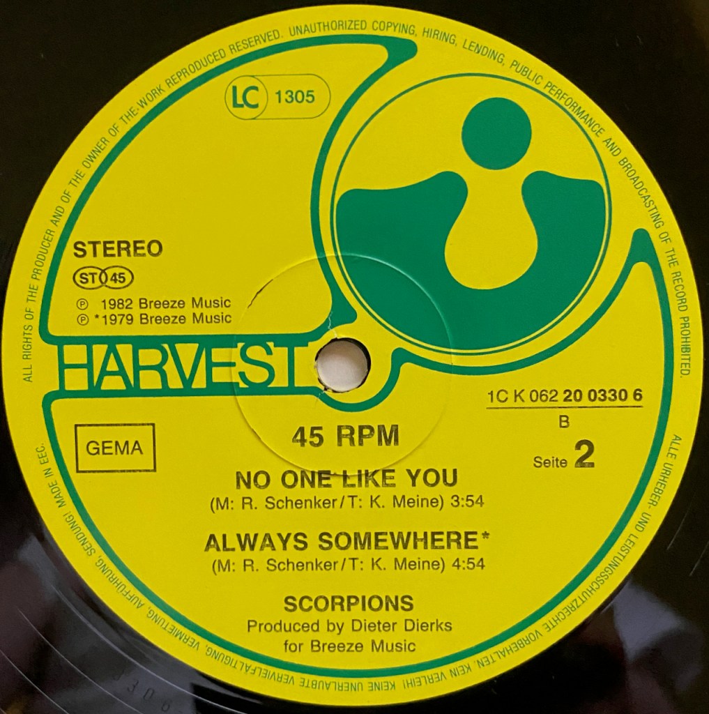 Side 1 was only the single “Still Loving You” from their latest album ‘Love at First Sting’. Side 2 was the song “No One Like You” from 1982’s ‘Blackout’ and “Always Somewhere” from their 1979 album ‘Lovedrive’. A good way to promote the back catalog. The songs are studio tracks and not remixes, but that’s okay because it is still a cool piece for me to have in the collection especially since was, as I said earlier, a German only release.