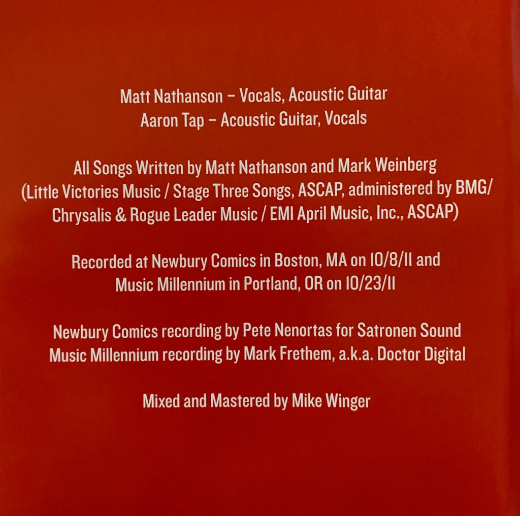The E.P. consists of songs taken from his performance at Newbury Comics in Boston, Mass on October 8, 2011 and from his show at Music Millennium in Portland, Oregon on October 23, 2011. Like the last, it is filled with acoustic songs from his current album and a ton of great banter with the crowd. This time around, Matt brought his good buddy Aaron Tap along to assist on the acoustic guitar and the banter and the two together are quite a comic duo.