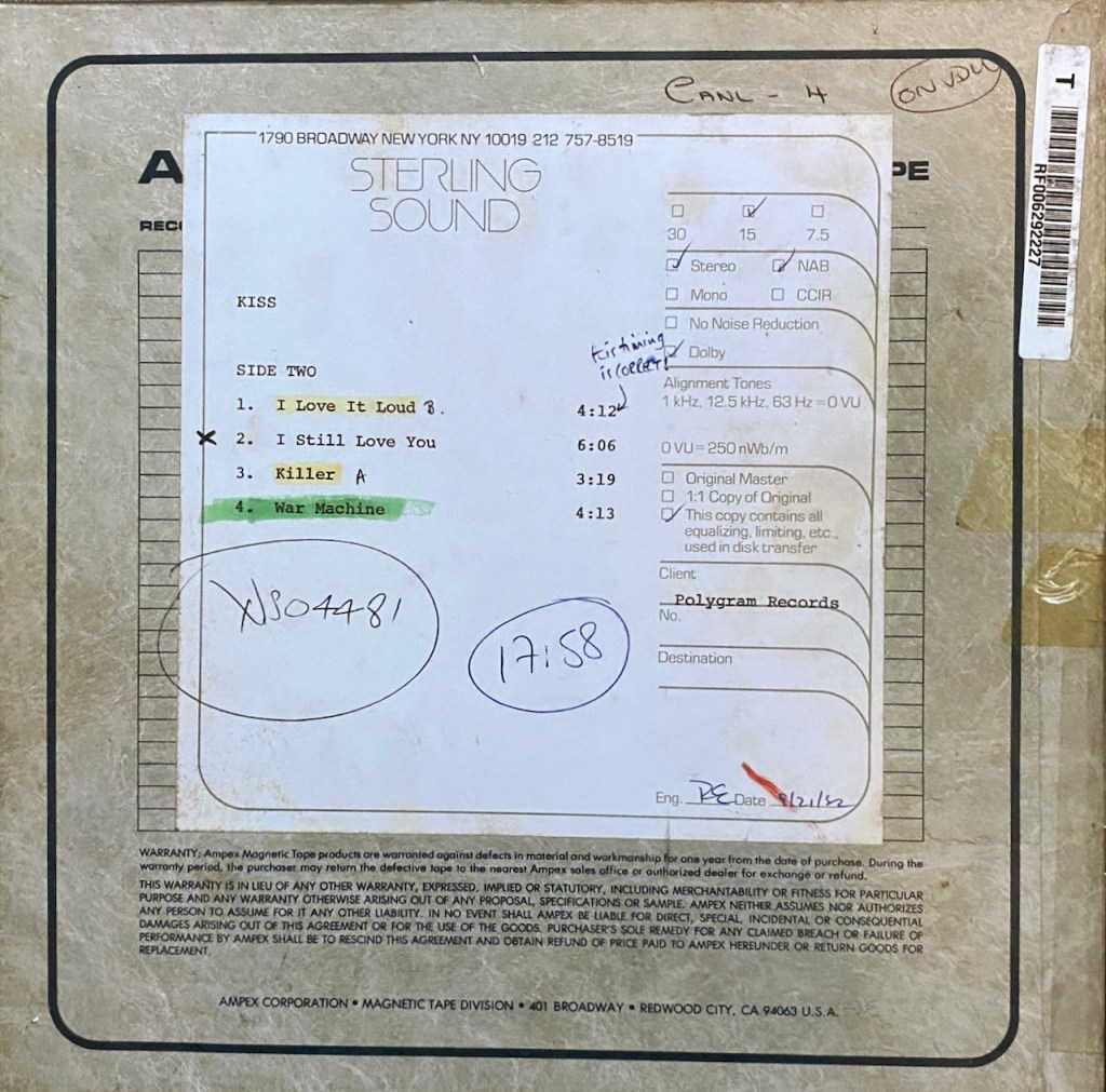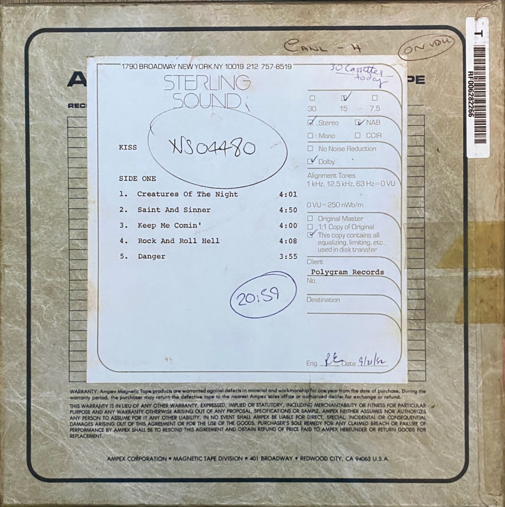 The second side starts off with one of Kiss’ most famous unreleased tracks, the Gene demo of “It’s My Life”. Wendy O. Williams covered this song for her album W.O.W. Then it is the best unreleased track on this whole set. “Not for the Innocent” which wound up on the album ‘Lick it Up’ in a final form, but this version is something Kiss should’ve been doing more of. It was a duet version with both Gene and Paul and it is simply Fucking Awesome!! This alone was worth the price of admission for me. A huge missed opportunity for the band!! Then we get two Creatures tracks with the 2nd take of the song “Rock And Roll Hell” and then an alternate Mix (#21) of “I Love it Loud”, and both are great. Lastly, we get a track that has never come out and it is only drums and guitar for the song “Don’t Leave Me Lonely”. All of these are only a sample of what is on the full Super Deluxe Set.