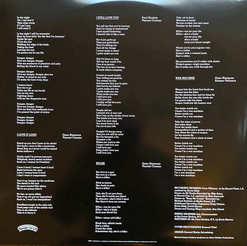 In this booklet, you get 20 pages of new interviews and photos, but not as in-depth as the 80-page hardback book you get in the Super Deluxe Edition. You do get interviews with Gene & Paul on the The Plan for the album along with Michael James Jackson, the producer. You get stuff on the Tour, the music video for I Love it Loud, the guitarists, the drum sound and on the publicity surrounding the album. It really is some great stuff. You will also be fascinated with the vivid color pictures of the band. It is really a sweet booklet.