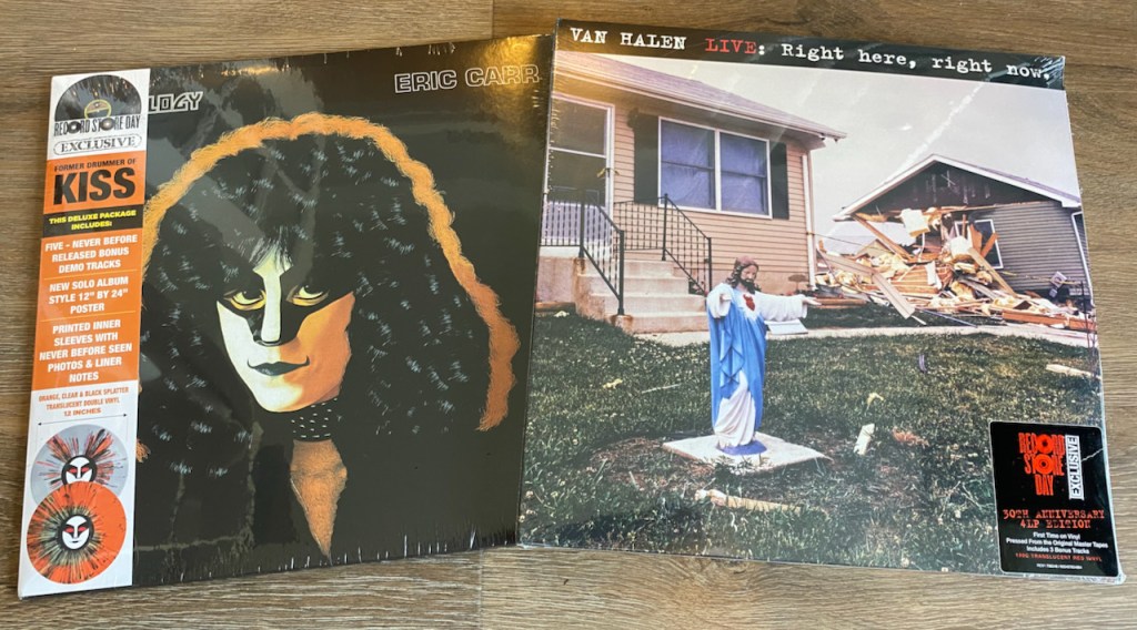 Now we are to Record Store Day 2023 which was on April 22nd. I left the house at 5am and got to the record store at about 5:30 which is about 30 minutes earlier than I normally go to get in line. And the line was insane. I am usually only 15 people back but I was over 30 people back. And it was going to rain. I was not real happy. Well, since it was going to rain, the owner started letting people in a few at a time ahead of schedule. The caveat was he can’t check us out until 8, but who cares it is going to rain. I get up to the door and finally make my way in and it starts raining…Whew…one good thing. then I found everything I wanted…turned out great!! I went for these two albums…Eric Carr’s Rockology with 5 bonus tracks and the Van Halen Live, Right Here Right Now which is a first time on vinyl release…