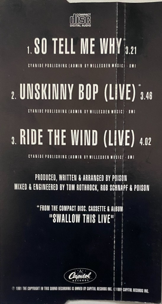 And there you have it. The UK CD Single for “So Tell Me Why” is a nice piece to the collection even if it doesn’t offer up anything new for me, but I live in the US and my ‘Swallow This Live’ actually has both live songs. If I was in the UK, that would be different. I do like the autographs on the CD as I see that as a nice touch, but I really only got this to pad the Poison collection and because this was pretty cheap. I like that in a CD. Thanks for hanging around and I hope you have a wonderful day!