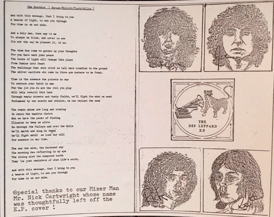 Included in the original E.P. was a photocopy of the lyrics to Side One on one side and the lyrics to Side Two on the other including drawings of each member by Dave Jeffrey with their signature.  On the back side of the insert, Def Leppard added a note to thank someone special that was left off the E.P. cover…”Special thanks to our Mixer Man Mr. Nick Cartwright whose name was thoughtfully left off the E.P. cover !”.  I am glad they recognized him this time. The copy of the 7″ I have does not have the insert.