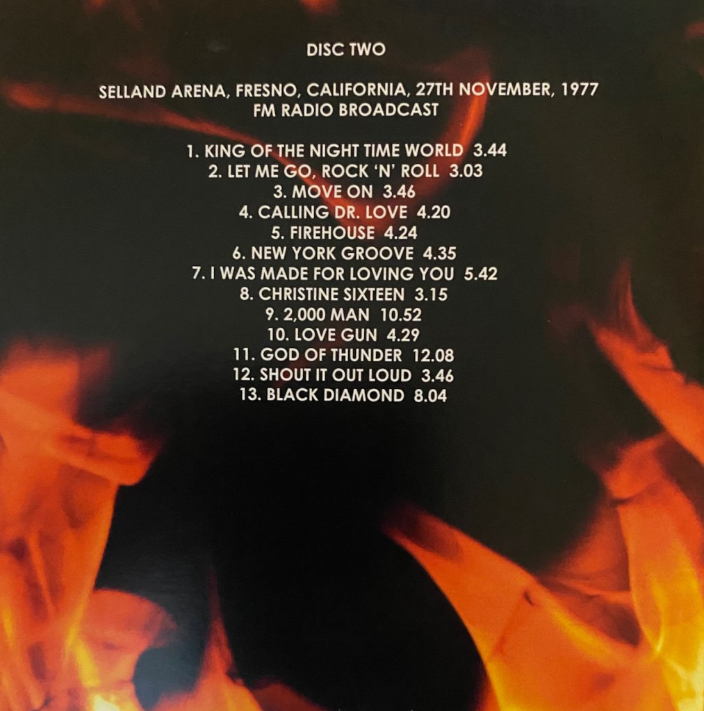 This next one is listed as from November 27, 1977 and if you look at the track listing, you know that is a massive impossibility as it has a couple tracks from ‘Dynasty’ which wasn’t until 1979, so I think the show is right at Selland Arena in Fresno, California, it is just the year should be 1979. Though I do have a ‘Dynasty Tour’ show, it is from a July show so this is one I do not have and glad I do. The show I have has 20 tracks and this one only 13 so not a full show, but still so great songs and even a couple solo tracks. I like that.