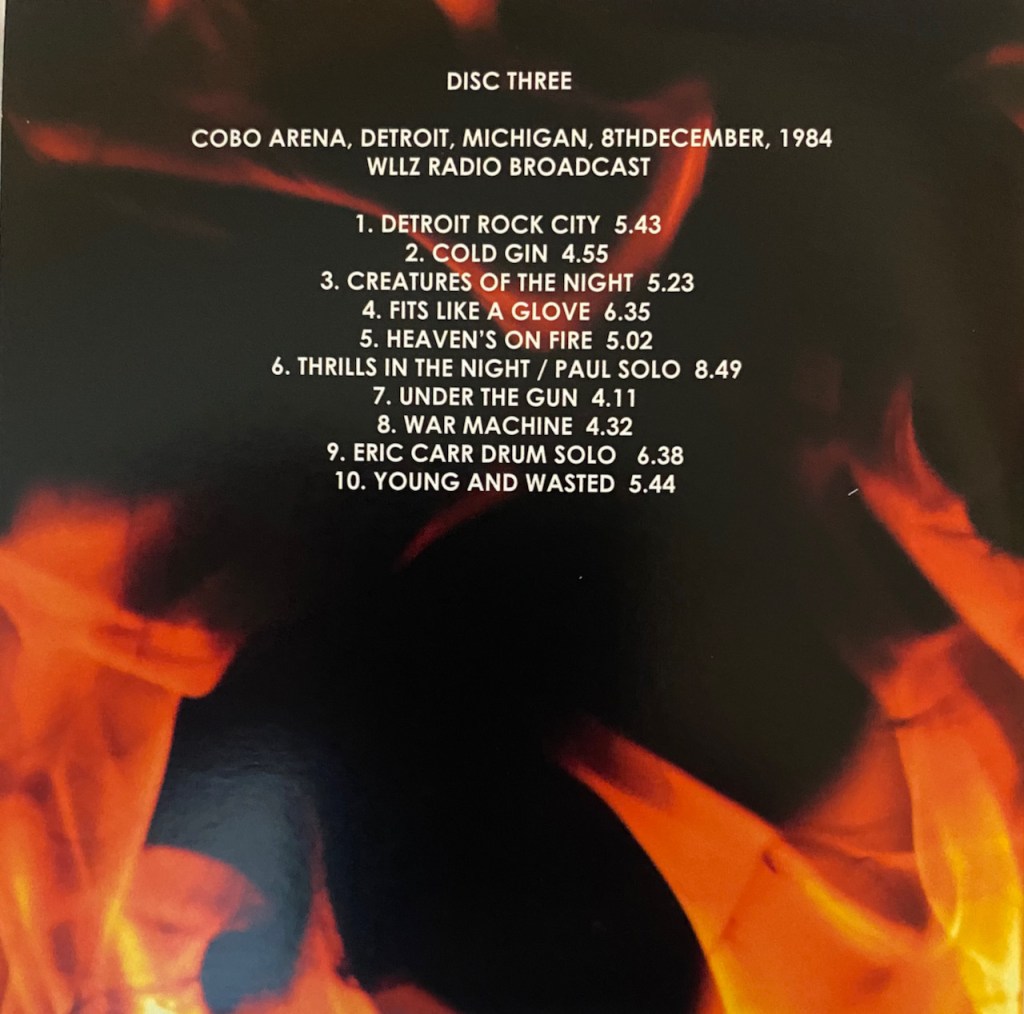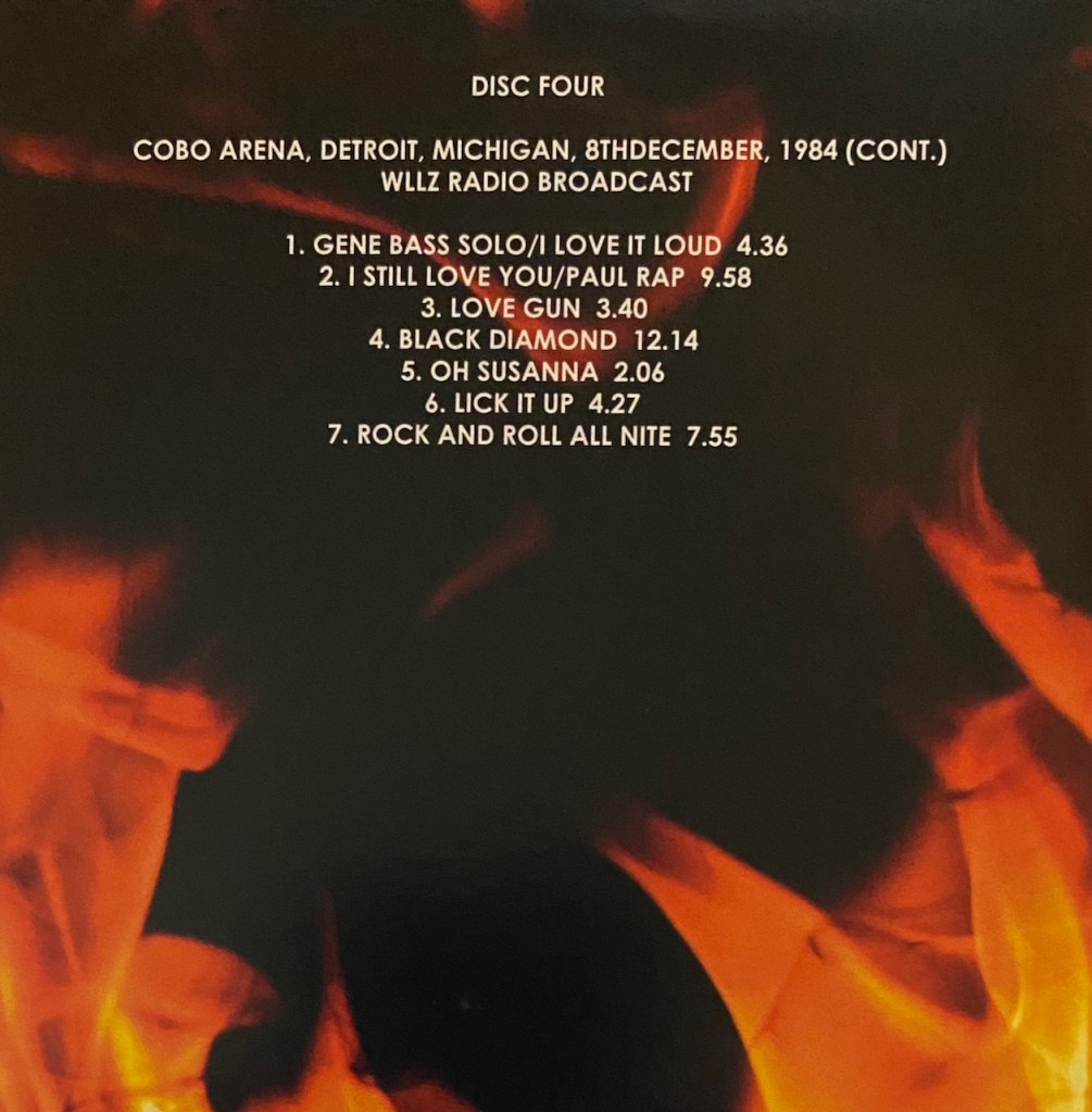This show is the Cobo Arena in Detroit from December 8, 1984. I actually have two bootlegs from this tour with a U.S. show and a European show. And if you count the ‘Off the Soundboard’ show with Mark St. John, I have three shows from this tour…and now I have a fourth with this one. And I won’t complain as look at that set list. It is pure 80’s era Kiss. This was the time where I really got in to them again so one of my favorite eras of the band.