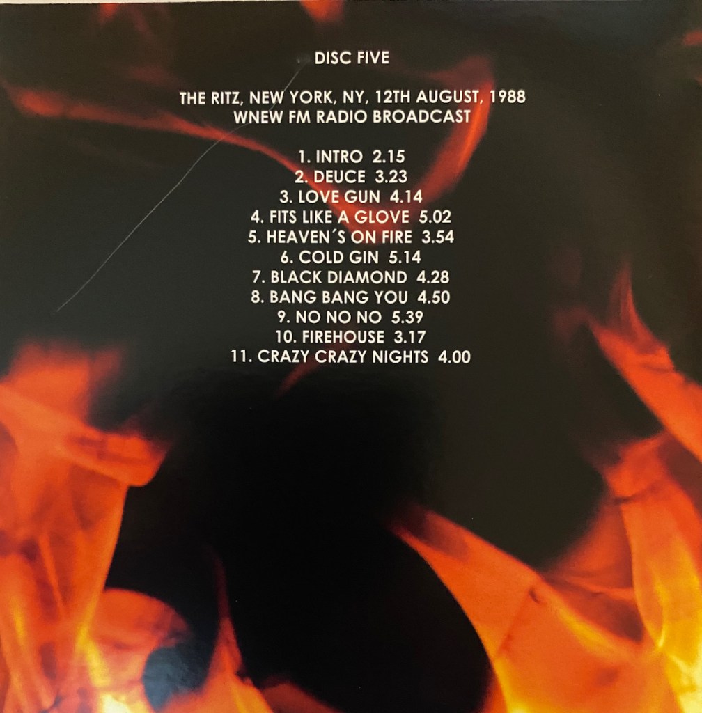 - Kiss – The Ritz on Fire (August 12, 1988, The Ritz, New York City. A radio broadcast – Crazy Nights Tour)