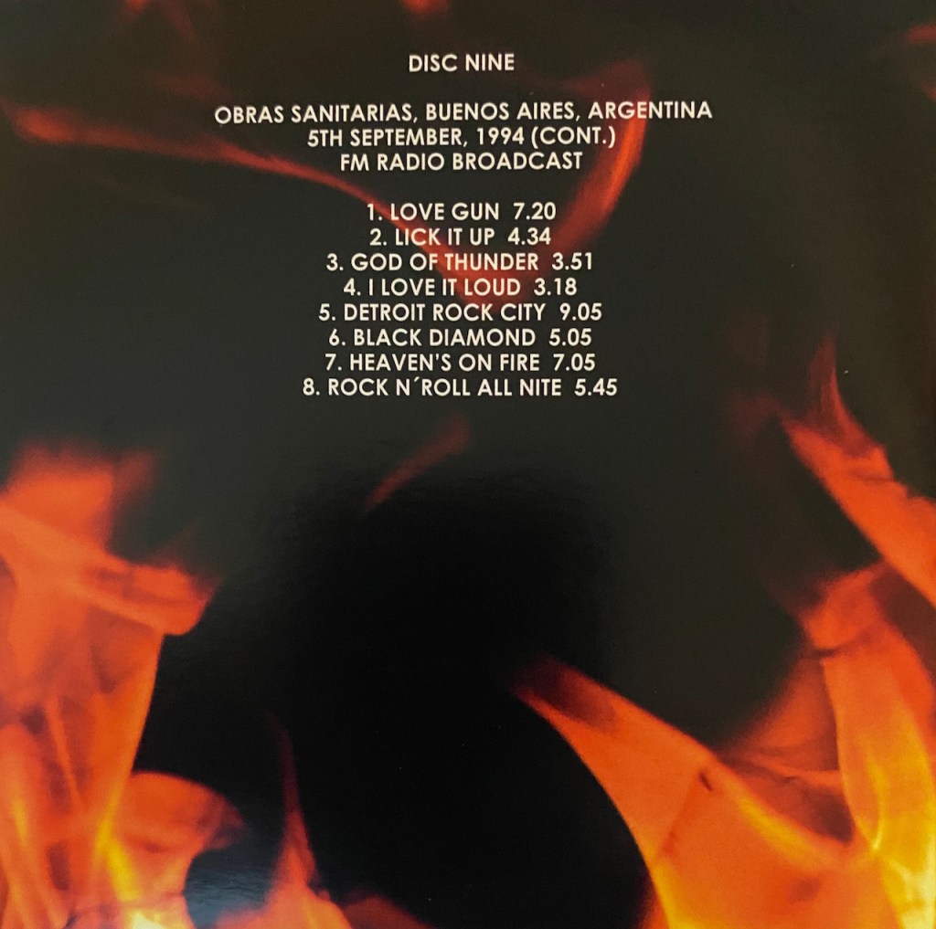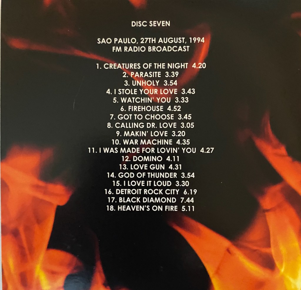 If there is one thing I love to find and that is Kiss Bootlegs. Whether it is on CD or vinyl, I don’t really care. I do prefer vinyl, but I’ll take it on CD as well so I can play it anywhere once I load it up to the cloud. This time around it is a CD bootleg. And not any CD bootleg, but a whole collection of radio broadcast from over the years. In fact, there are 8 shows spread over 10 CDs and includes 119 tracks. A good coverage of years from as early as 1974 all the way up to 1994. I guess there aren’t too many broadcast after the 90’s as you can see from below…