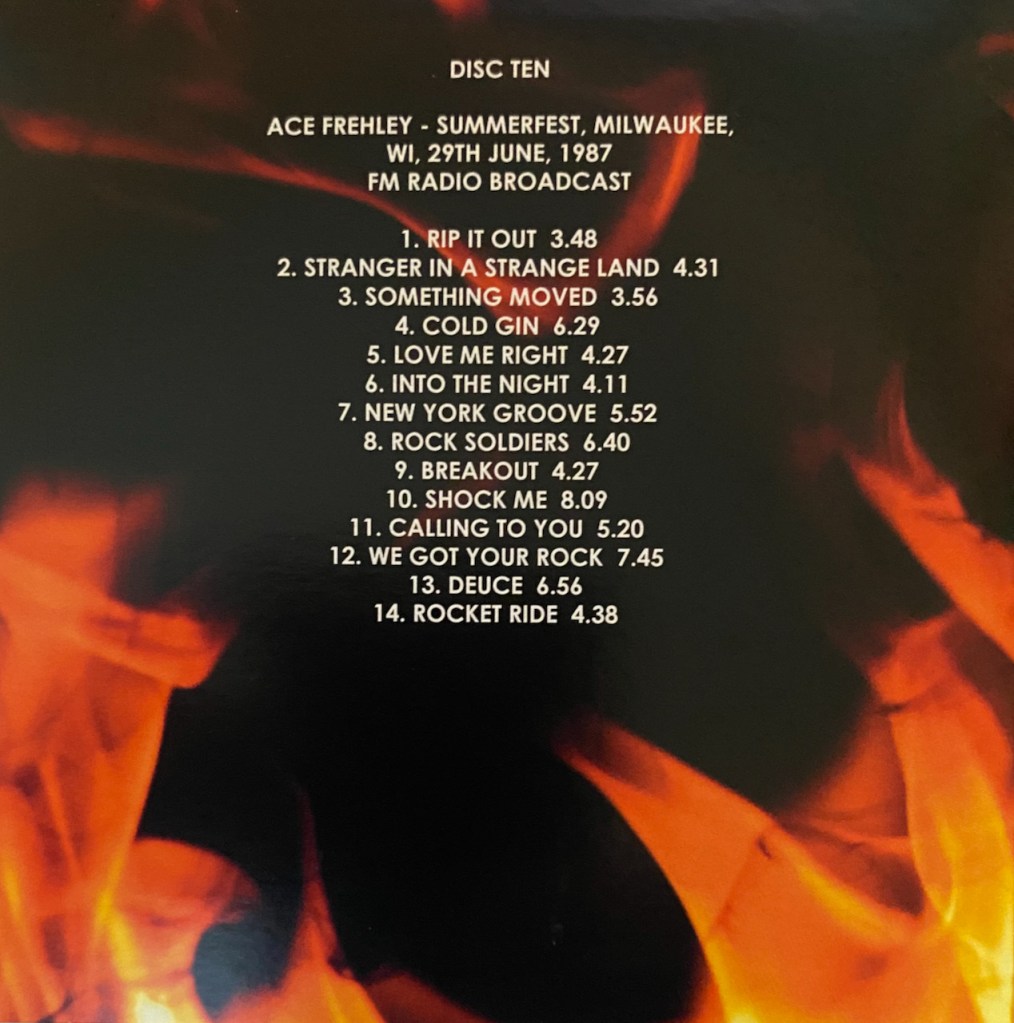 This is my first Ace bootleg, but to be fair, it isn’t really “Ace”. No, it is his band ‘Frehley’s Comet’ on tour supporting their debut album. The show was June 29, 1987 and it is fantastic. You get Ace on vocals for some songs and Tod Howarth on others. It is a set chock full of hits and you get all the great Kiss songs that Ace was a part of and all the great Frehley Comet songs as well. What more could you want. This is the main reason I wanted this set and I am glad I have it.