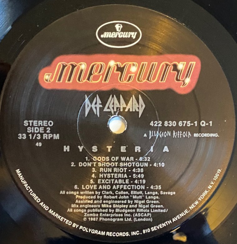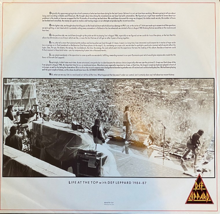 The album was a labor of love for the band as it took several years to record and they struggled so much during this time. There were so many setbacks during the recording of the album. First, Robert John “Mutt” Lange turned down the producing job for the record after he had recorded “High & Dry” (my personal favorite) and “Pyromania” although he did help in the initial song writing for the record. The band went through several producers during the recording including working with Jim Steinman of ‘Bat Out of Hell’ fame. Their relationship did not go smoothly and he was later fired (they paid him a lot of money to get out of the contract so it must have gone really badly). Later in the process, “Mutt” did come back and produce the final product and then history was made.