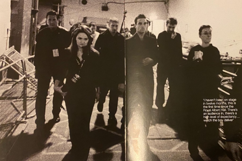 The show opens with a performance of “Trouble/Handsome Man” which happens to be the same songs that Elvis Presley opened with for his ’68 Comeback Special which Robbie has recreated the same stage set up except it has a big “RW” rather than an “Elvis” sign. When he goes out in front of the crowd it is a small round stage in the middle of the crowd with only Robbie and the bad was off behind the crowd. When he runs out and does “Rock DJ”, his energy and the crowd is electric. This was the firs time he had been on stage in 12 months.