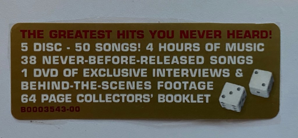 The back of the tri-fold box set shows the track listing for every CD as well as the DVD track list. But it doesn’t say everything. The sticker on the front also broke it out…and the Japanese set included something similar…