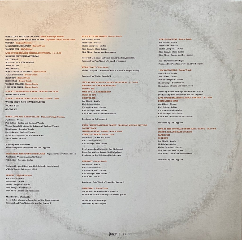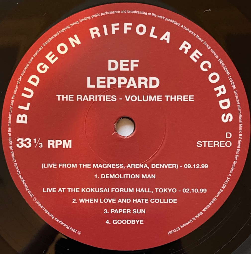 The flip side is more live songs and this time they are from the ‘Euphoria’ tour not the ‘Slang’ tour. First track is “Demolition Man” from the Magness Arena in Denver, Colorado on December 9, 1999. It sounds like the album version but sped up even more then the tempo on the album if that is possible. Even though I think the album version has a little more punch. Next are three songs from Kokusai Forum Hall in Tokyo from October 2, 1999. These are three songs we will talk about again next week as I have the full bootleg show and we will review it in full. For now, let’s talk these three songs. First is “When Love and Hate Collide” and they do a great job. A classic Lep ballad played but a little flat here…sorry guys.