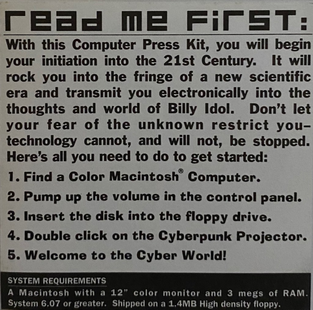 Along with the disc was an insert that gave instructions on how to use the disc. Of note, the disc was only formatted for a Macintosh computer so no Windows version yet. On the flip side was a logo of the Cyber Corporation which is part of the whole concept of the album ‘Cyberpunk’.