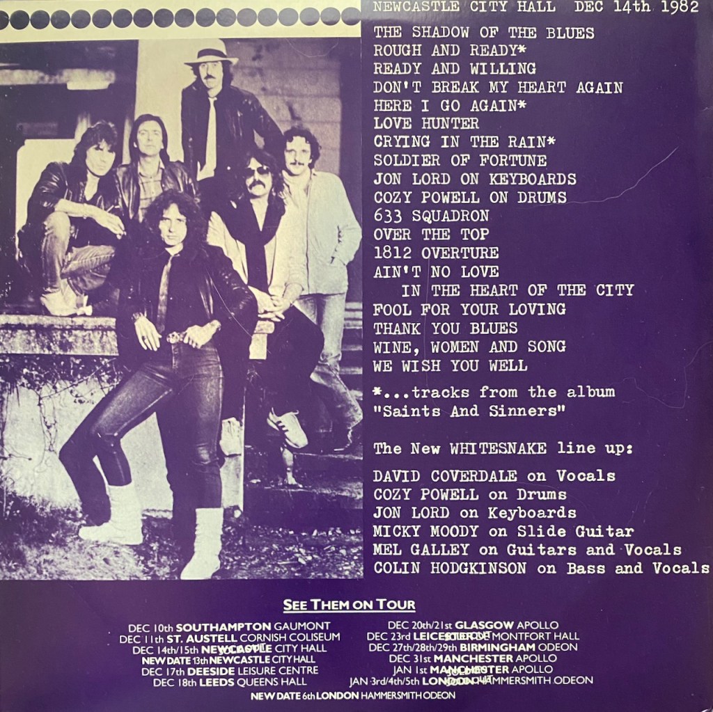 Over the last 6 months, I have found a ton of bootlegs and for me that is great as I love getting this tidbits of history from a band especially since the band haven’t released it. There was a stretch of a few months where I found three Whitesnake bootlegs and this is the last of those that I found. This one is from the tour for ‘Saints And Sinners’ which ran from 1982-1983. And the band is listed as David Coverdale, Cozy Powell, Jon Lord, Micky Moody, Mel Galley and Colin Hodgkinson. This particular show is said to be Newscastle City Hall in England and recorded on December 14th, 1982. It is a 3 LP set and is the whole show and was released in Japan. No OBI so don’t get excited, this is a bootleg.