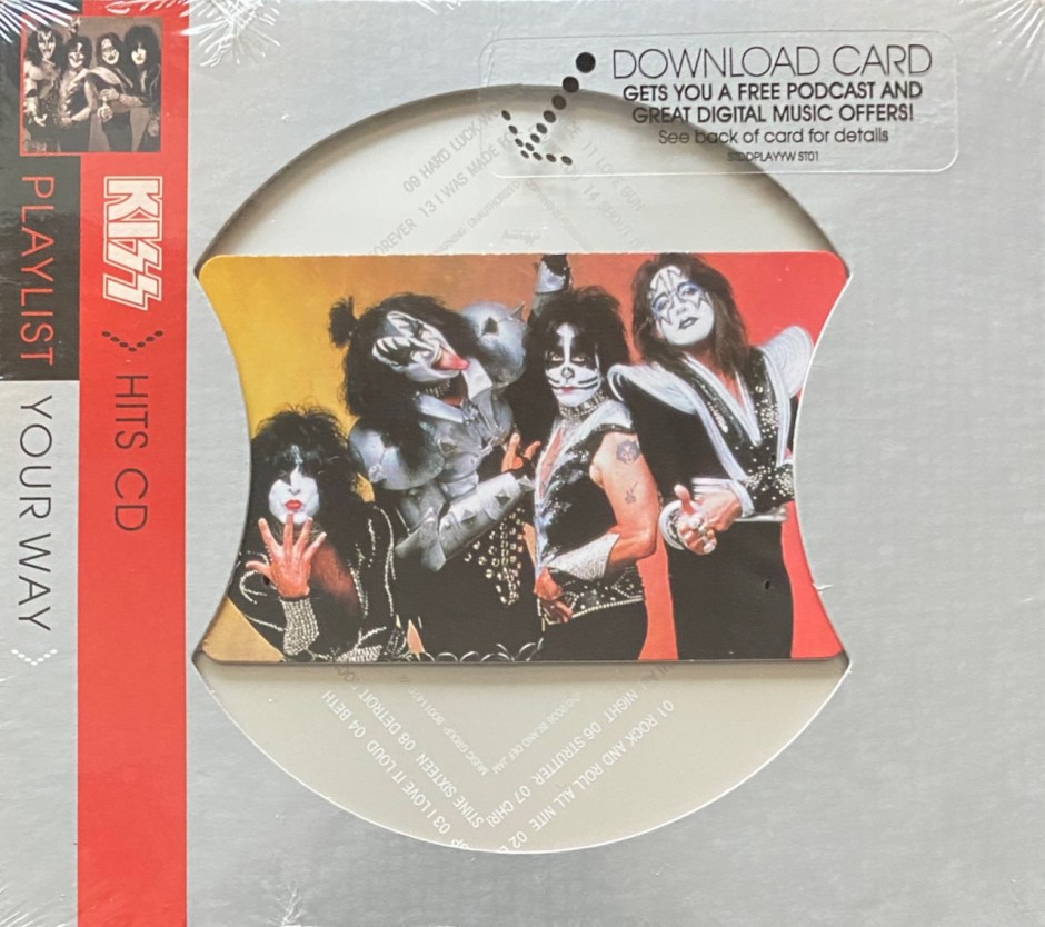 Kiss is known for having a million greatest hits album and here we have another. This one is on the cheap side of things and is pretty basic. It is probably a label release and the band probably had zero to do with this one. It was released in 2008 by Mercury and UMe. It is called ‘Playlist Your Way’ and everything about it is cheap. The packing is a fold out cardboard that the CD is housed in. The cover has a big cutout and slipped in is a credit card size cardboard with a picture of the band on one side and a code on the other I believe to download some ringtones. This was 2008 and everyone wanted a ringtone so why not a Kiss one. The card could only be used in the U.S. and my copy was a sealed brand new release so the card was never used.