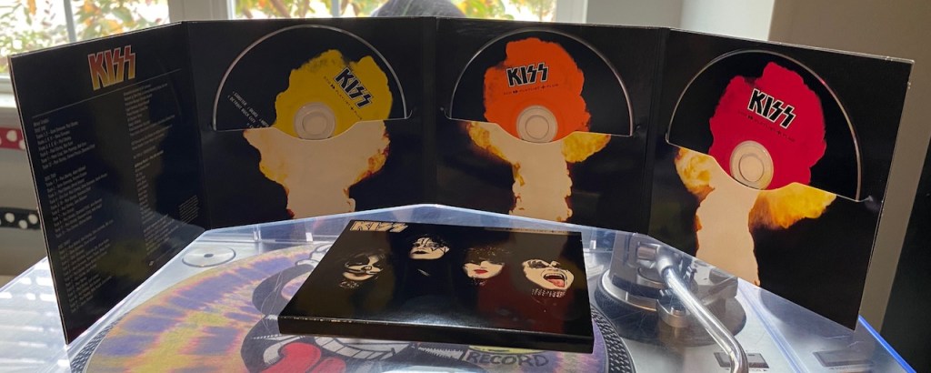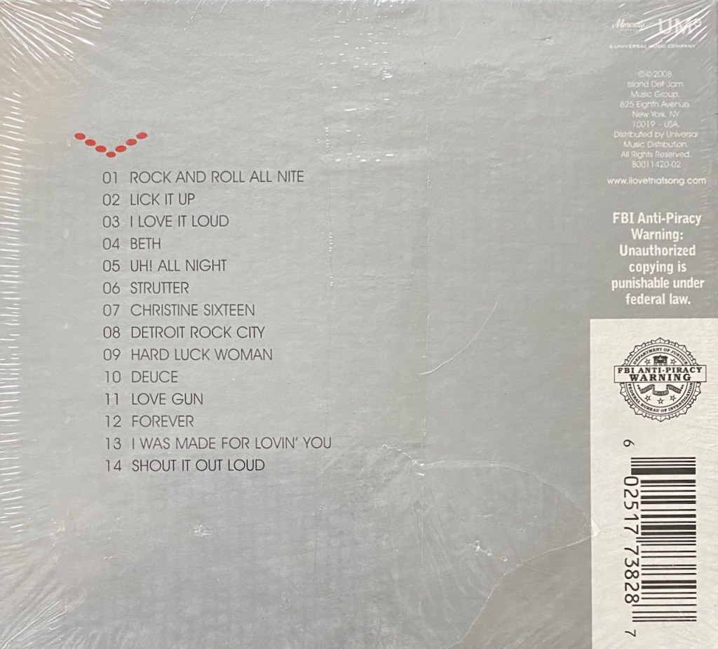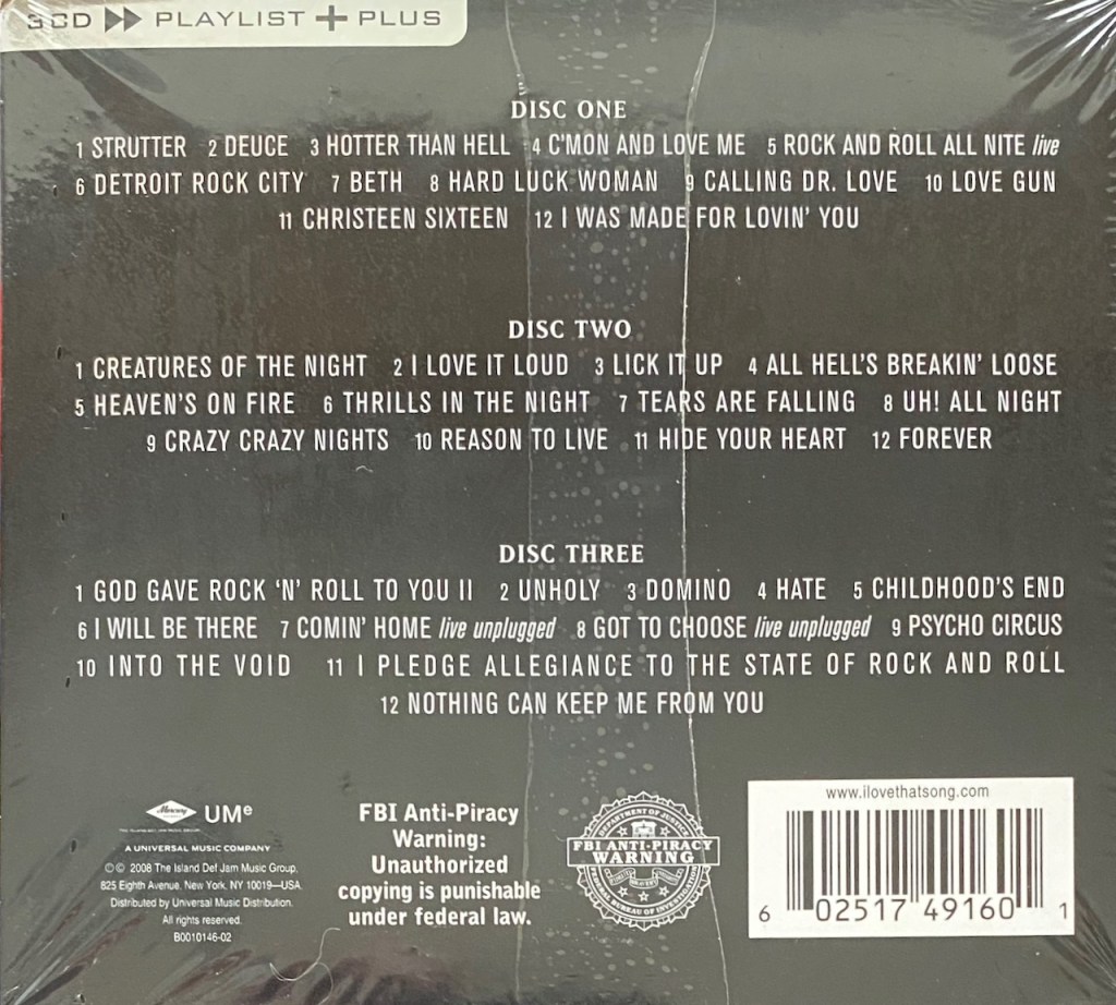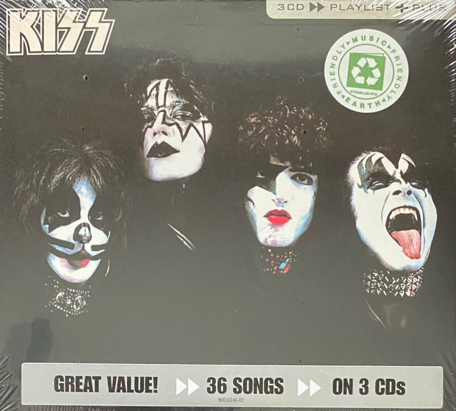 The 2000’s were a huge time for Kiss…well, for the label to release greatest hits compilations that is. There are dozens. One of the easiest ones to find is The Millennium Collection which was actually a 3 volume set with a volume released in 2003, one in 2004 and the final in 2006. 2 years after the Volume 3 set was released, Universal decided, why not repackage it and release it all in one set. Sure, why not! As a result, we get ‘3 CD » Playlist + Plus’ which was repackaged as a Double-Gatefold Cardboard set up covered in a Slipcase. It was even promoted as an environmentally friendly set (despite the plastic that wrapped around the set).