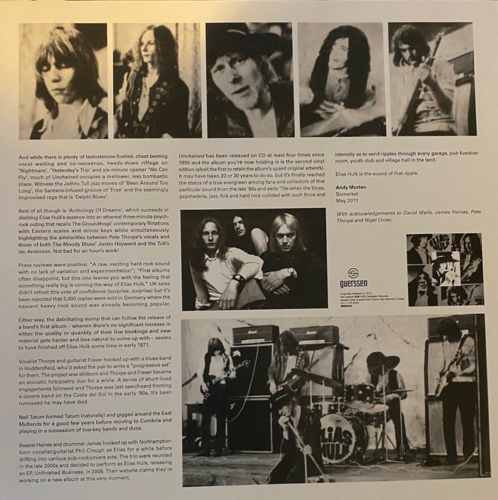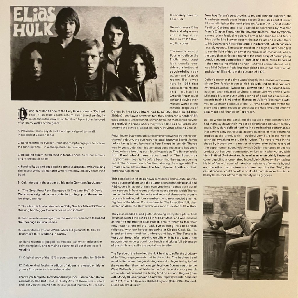 For this review, we are going to look at a band that had one album and was done. A One And Done band called Elias Hulk. The album was released in the UK sometime back in 1970. The band was originally called Alias the Hulk due to their love for Marvel Comics and The Incredible Hulk. Eventually the name was shorted to Elias Hulk. The band consisted of members James Haines (Bass), Bernard James (Drums), Neil Tatum (Lead Guitar), Granville Frazer (Rhythm Guitar) and Peter Thorpe (Lead Singer). And as far as sound, they are a cross between a heavy bluesy rock with some psychedelic hard rock mixed and some Eastern elements that add a cool uniqueness to their sound. And if that wasn’t enough, it is a little proggy as well. I would say that it is a pretty accurate as we definitely have some heavy moments and then some not quite so heavy, but all sounds are still rock and still kick ass.
