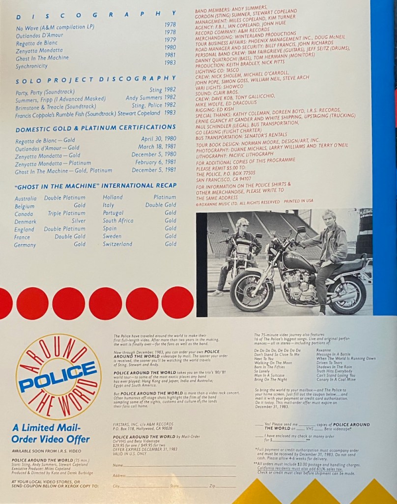 And if you notice on the page above, Stewart and Sting are on motorcycles, so why not have a Motorcycle company advertise in the program. Heck, it helps cover the cost of the books I am sure. Yamaha Motors along with MTV sponsored the tour so makes sense.