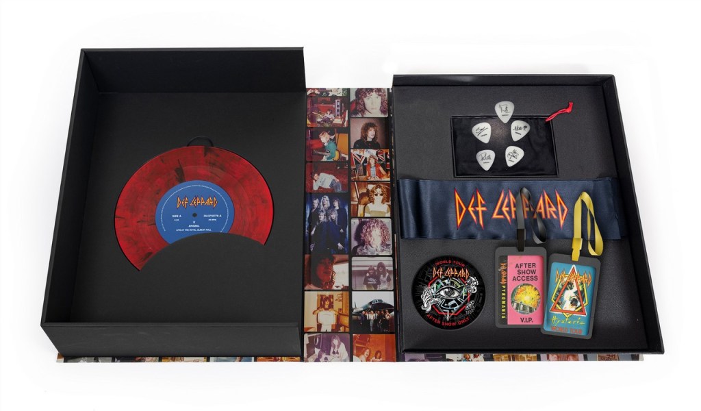 The Collector’s Copies were Numbered 351 to 1,500. The Collector copies are 3/4 quarter bound in black vegan leather, with a portrait of the band printed on an aluminium plate front cover and the Def Leppard logo blocked on the back cover. The 296-page book is finished with colour foil blocking on the spine, and red page edging. Every copy in the edition is signed by Joe Elliott, Phil Collen, Rick Savage, Rick Allen and Vivian Campbell. Presented in a clamshell box covered in a montage of images with an inset Def Leppard logo sticker and tour pass, the interior lid holds a specially pressed 7″ single. The red and black marbled vinyl presents two previously unreleased live recordings: the A-side is ‘Animal’ (performed at the Royal Albert Hall, 2018), and the B-side is ‘Slang’ (recorded in Las Vegas, 2019). A compartment under the book includes five Diamond Star Halos guitar picks in a small cloth bag and three replica tour passes. A large pull-ribbon, printed with the Def Leppard logo, lifts the book.