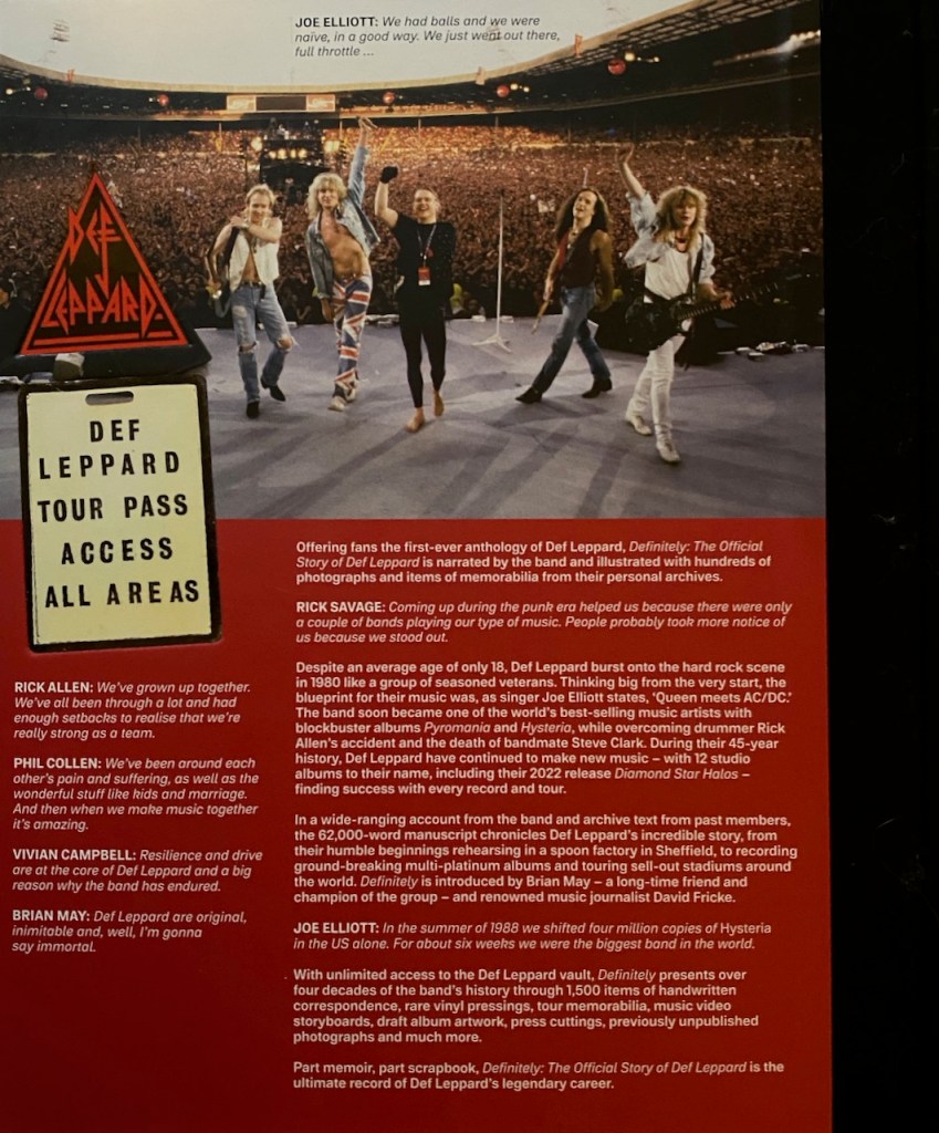 In 2023, Def Leppard felt it was time to tell their story, in their words. ‘Definitely: The Official Story of Def Leppard’ is a personal account of Def Leppard from their formation all the way up to 2022’s last studio album ‘Diamond Star Halos’. The book was released in 2023 and there were several versions you could buy. By the time I got around to buying it and the only option available to me was the Publisher’s Edition which is strictly the book. There were other options you could’ve purchased as well.