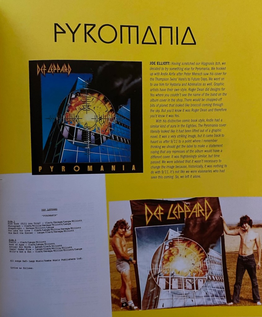 The stories by the band or personal and honest. The go in to detail about what was going on at the time with the band and discuss the making of the albums, the writing, the touring and anything significant that was happening in their lives such as firing of a member, deaths, losing an arm, cancer, divorces, etc… Some of the stuff I had already heard about, others I didn’t know. All very interesting. I loved hearing about touring and the making of the album the most. I loved how each chapter began with the cover art and how they came up with the cover and packaging like with ‘Pyromania’…
