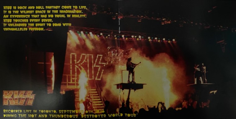 The show stsarts with the annoucer screamning “Alright Toronto, You Wanted the Best and You Got the Best…KISS”. This was louder then when the band actually starts playing “Detroit Rock City”. Paul’s vocals are quite loud in the mix so you hear all his flaws (which aren’t many at this time in their career. Everything else isn’t quite as loud as Paul, but it is clear. Peter is keeping great time, Ace’s is playing is outstanding and the bass is laying the groove. A great performance. It is definitely a soundboard recording. It ends with a car crash as it should be and then it is “King of the Night Time World”. Gene roars in the backing vocals on the Chorus and Paul is still really loud and Ace is still killing it, so is Peter.