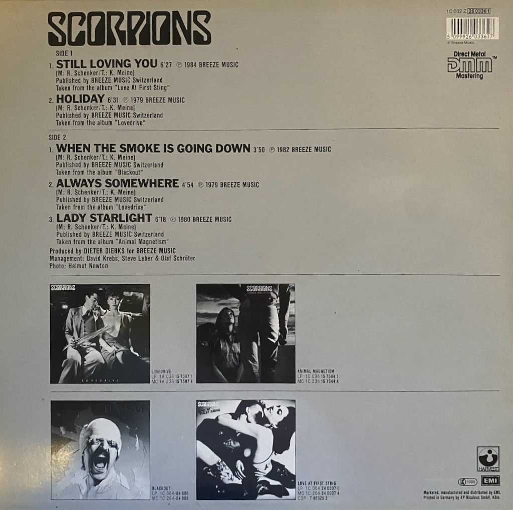 In the U.S., the label was capitalizing on the Scorpions success by releasing a compilation, so why not the European labels. 1984 was a big year for the Scorpions so lets milk it for what we can was the attitude of the day!. With the massive success of their ballad “Still Loving You”, why not release an E.P. of their best ballads and pick those from four of their best albums, ‘Lovedrive, ‘Animal Magnetism’, ‘Blackout’ and ‘Love at First Sting’. And ballads are big sellers, so it made perfect sense.