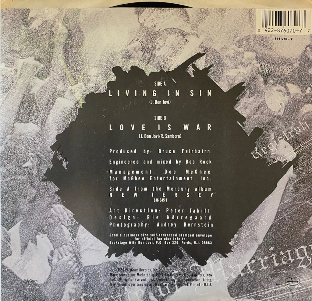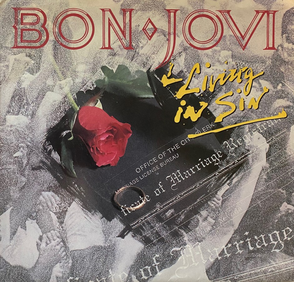In my quest to find good homes for 7″ Singles with picture sleeve covers, I came across another Bon Jovi single. This time around it is for the song “Living in Sin” off the mega-seller ‘New Jersey’ and was released on October 7, 1989. Bon Jovi was the king of power ballads and this fit the bill nicely as the song went to #9 on the Billboard Top 40 charts. It was the 5th and final single off the 7X platinum status album which means it sold over 7 million copies in the US alone.