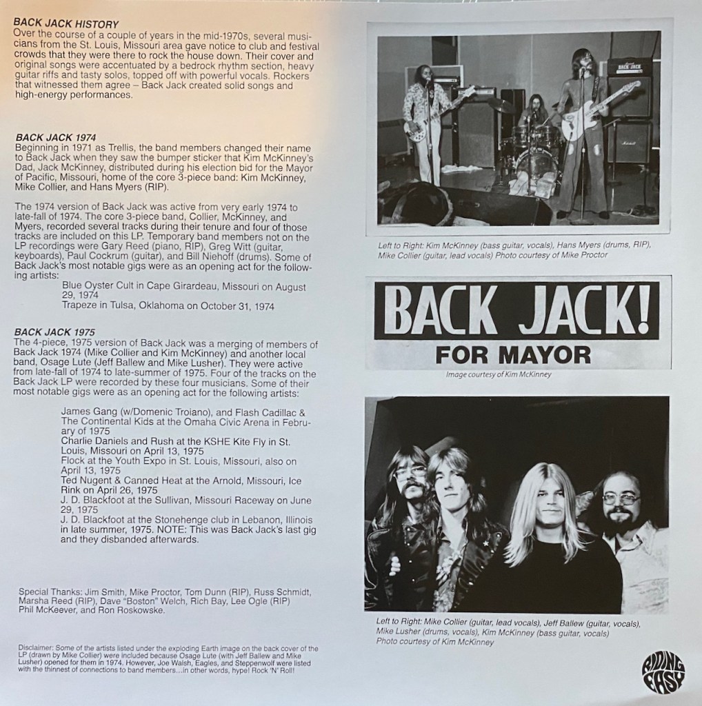 For some of these tracks, Back Jack consisted of Kim McKinney on bass, Hans Myers on drums and Mike Collier on guitar and lead vocals. The rest included a slightly different line-up though still Mike and Kim, you also get Jeff Ballew on guitar and Mike Lusher now on drums and that is the line-up pictured on the front cover. The name Back Jack came from Kim McKinney whose dad was running for mayor and the bumber stick said “Back Jack” for Mayor…and thus the name change from the original name of Trellis.