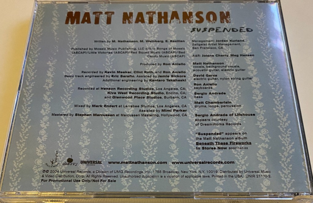 In my further quest for owning all Matt Nathanson items listed on Discogs, I found another gem. This Promo CD is for the song “Suspended” off his 2003 album and major label debut called ‘Beneath these Fireworks’. The song didn’t chart, no surprise as he’s never been a big radio hits guy (even though his stuff is better than radio). The album didn’t do well either and shortly after releasing his first major label debut on Universal, Universal dropped him. Such is the story of so many artists and bands.