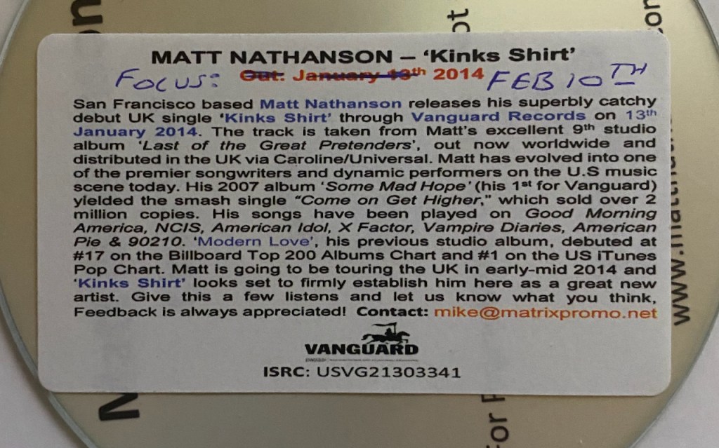 The song features singer LOLO and is off Matt’s album ‘Show Me Your Fangs’ released in 2014. It is one of his best albums as well, so check it out as well. The CD promo was sent out to radio stations across the country sometime in 2014 and “Headphones” is the only song on the disc. I’m not saying this promo single is rare, but there is only 1 person on Discogs that states they have it in their collection (and that person might be me) and one has never been sold on Discogs. I bought mine off eBay while scrolling early one morning. I couldn’t believe my luck.