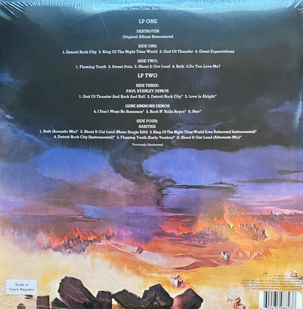 With the album ‘Alive’ in 1975, Kiss finally broke through and were on their ways to be Rock Gods!! But their next album needed to make a statement. It needed to capture the band like none of their other albums had been able to do. Famed record producer, Bob Ezrin, was brought in to man the boards all based on the work he was doing with Alice Cooper. Kiss needed that same energy and success. And did Bob deliver? Oh hell yeah he did!! ‘Destroyer’ was released on March 15, 1976 and with songs like “Beth”, ‘Detroit Rock City” and “Shout it Out Loud”, Kiss was on top. They had made it! A now platinum selling artist, a massive touring act and they were starting to reach heights they only dreamed about. At first thought, the album was slow out of the gate until “Beth” was played on the radio…it was the B-Side to “Detroit Rock City” and then Bam!! Everything changed. To celebrate this pivotal album, Kiss delivered the 45th Anniversary Super Deluxe Edition Box Set which we’ve already reviewed and it is jammed pack with goodness. This time we have the 2-LP Deluxe Edition Colored Vinyl which we are discussing. It isn’t as jammed pack but it is still pretty great for what it is.